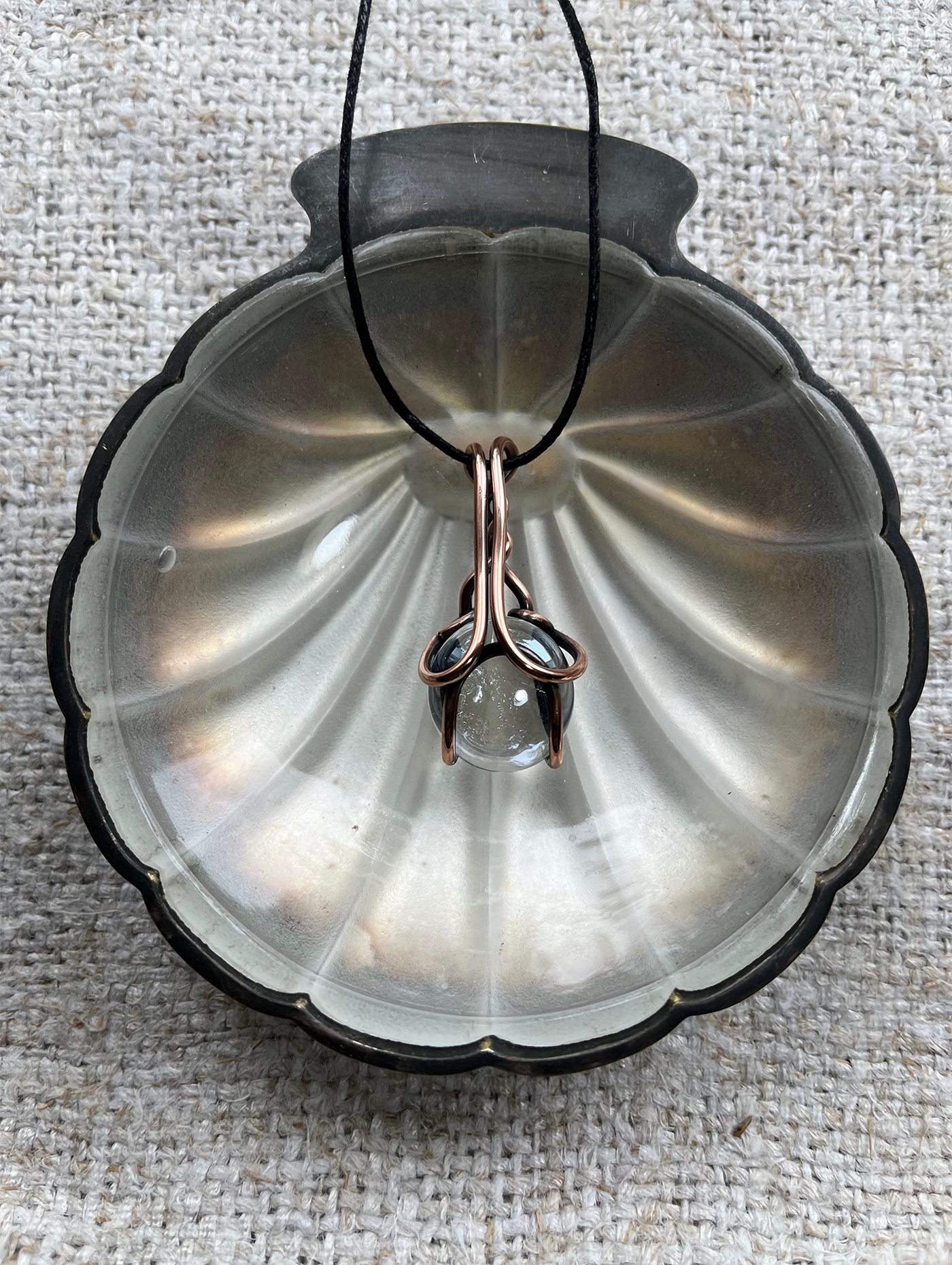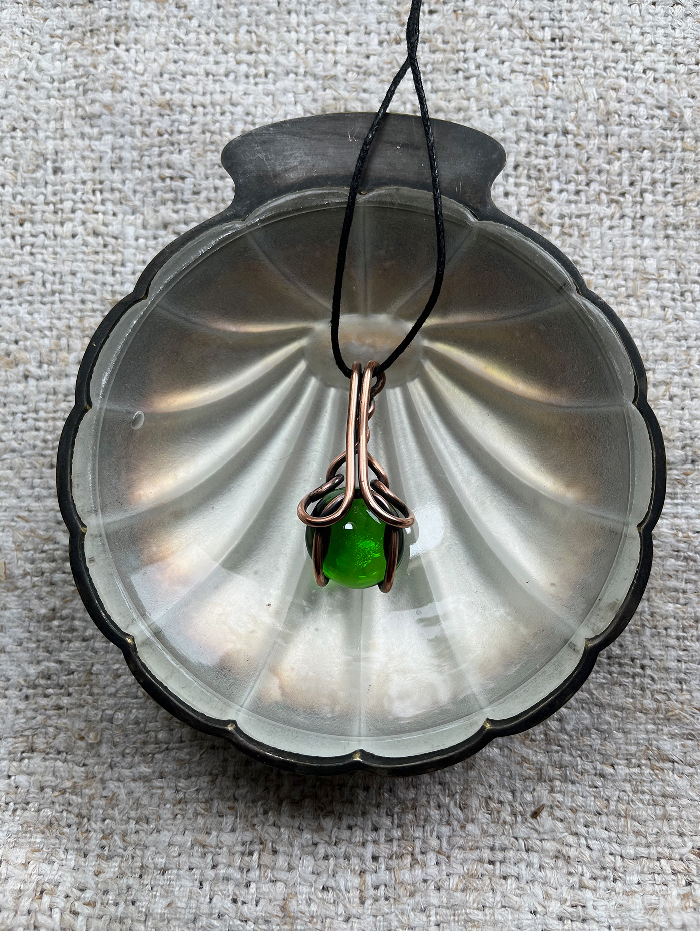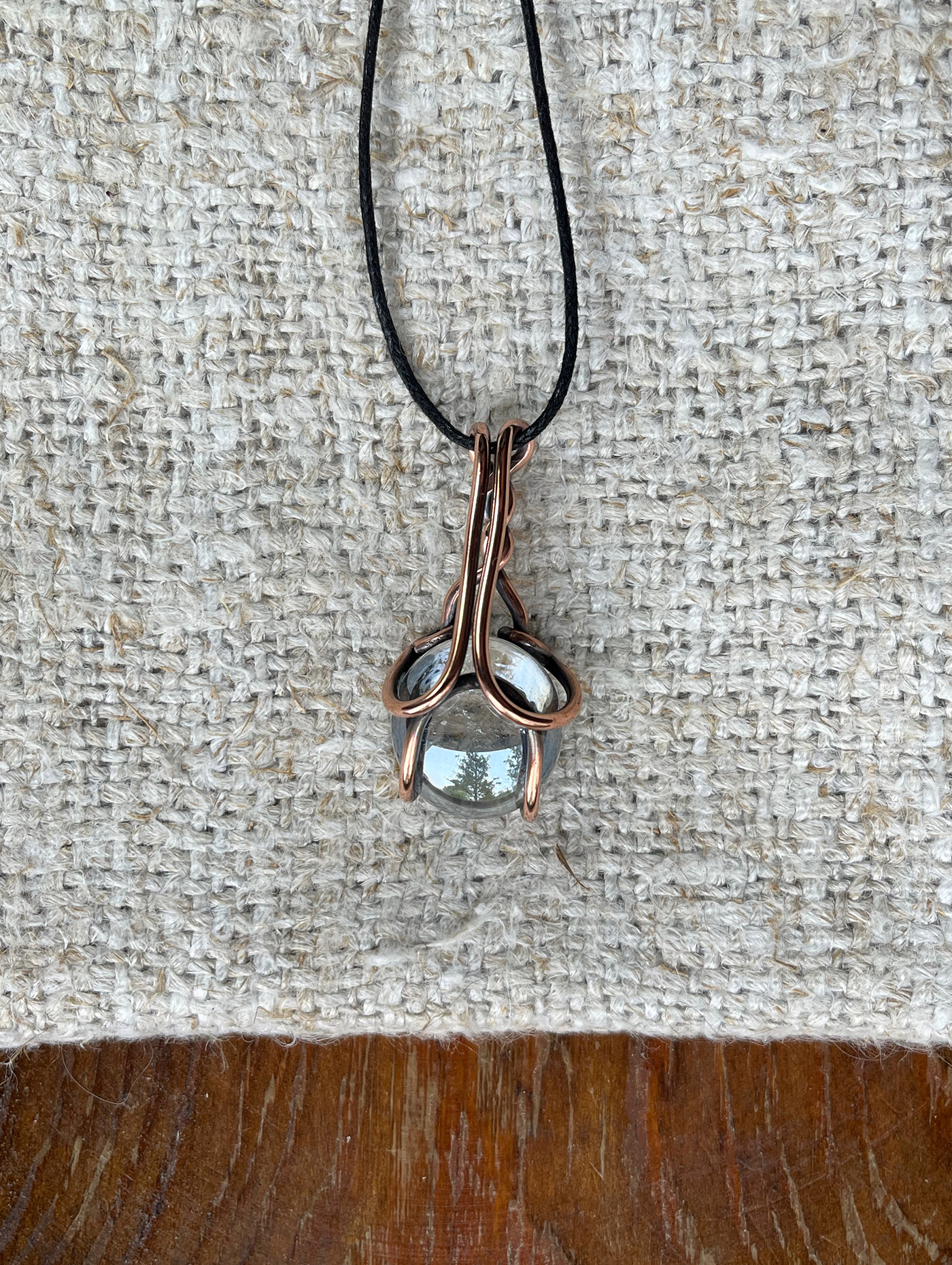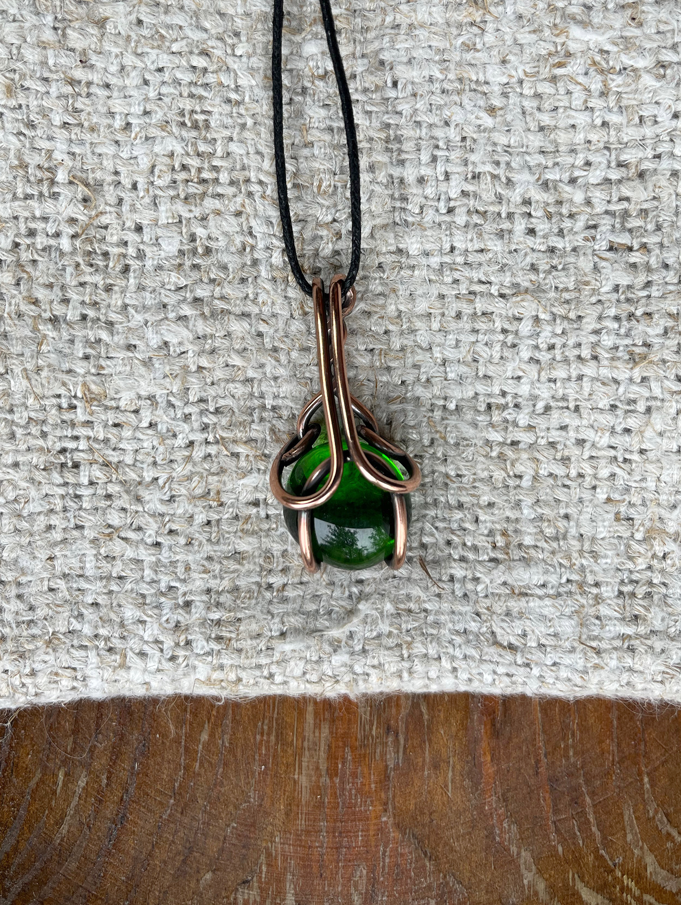 Kieppi-lasikaulakoru on valmistettu käsityönä kierrätetystä mosaiikkilasista ja kuparilangasta (sähkölanka). Kehyksen taivuteltu kuparilanka on antiikkipatinoitu ja kiillotettu. Lasin halkaisija on 2 cm ja riipuksen pituus kokonaisuudessaan 4 cm. Vahattu puuvillanyöri on 70 cm pitkä ja sen voi säätää pienemmäksi.