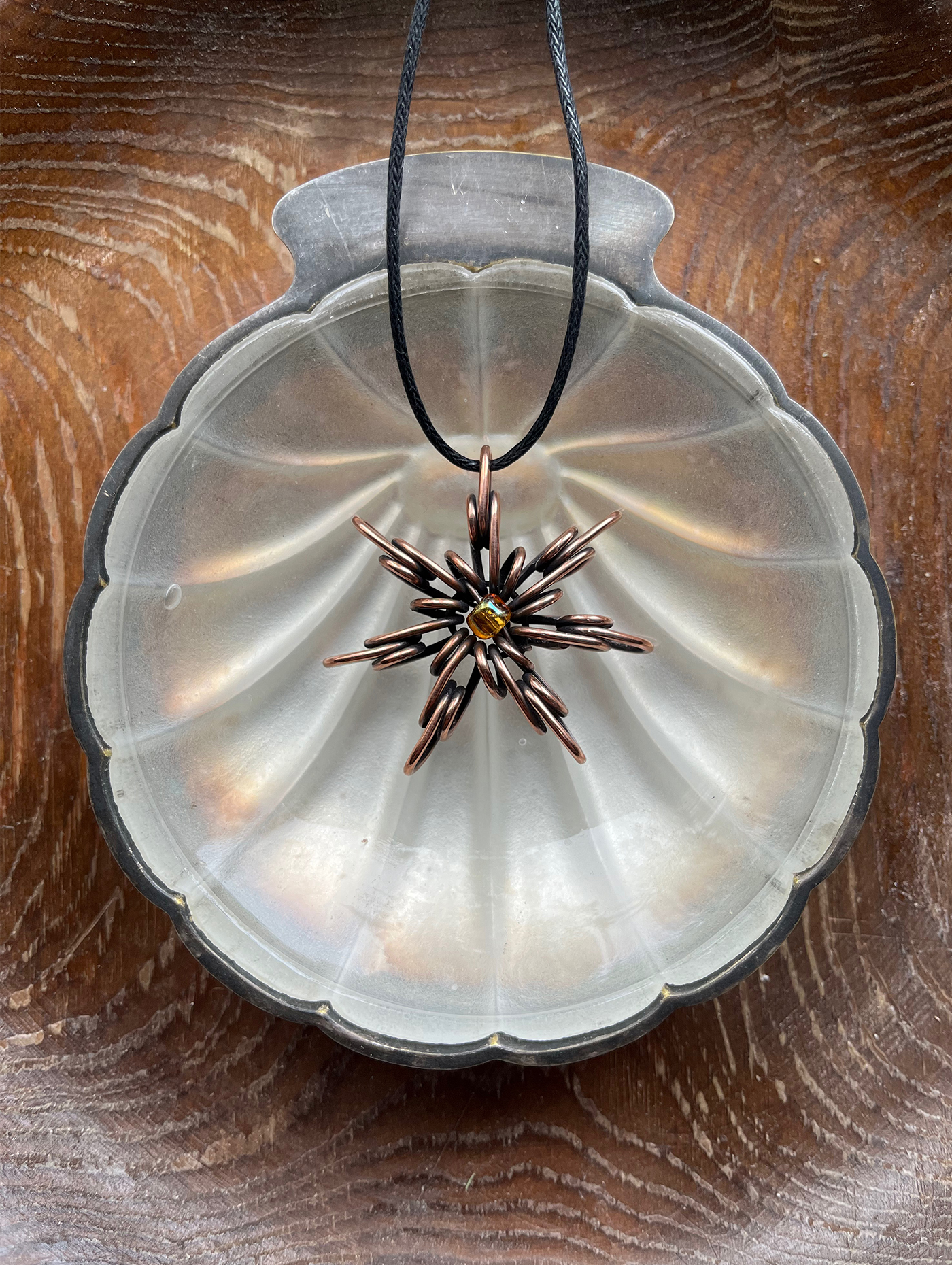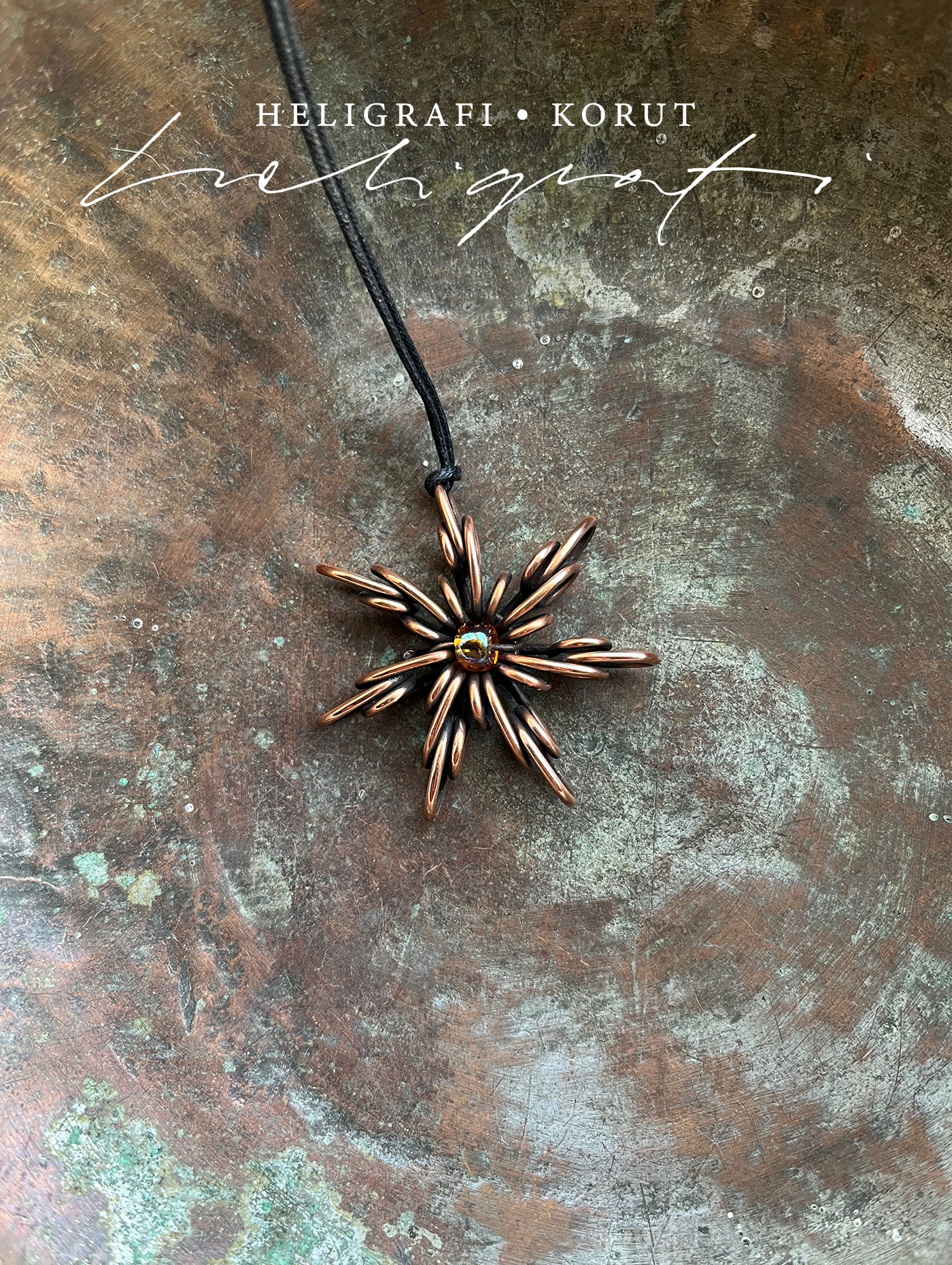 Kaunis Silmukkatähti-kaulakoru on valmistettu kierrätetystä kuparilangasta ja siinä on keskellä topaasinvärinen lasihelmi, jossa häivähdys sateenkaaren värejä. Tähden halkaisija on n. 4 cm. Musta vahattu puuvillanyöri on n. 65 cm pitkä ja siinä on säätövaraa pienemmäksi.