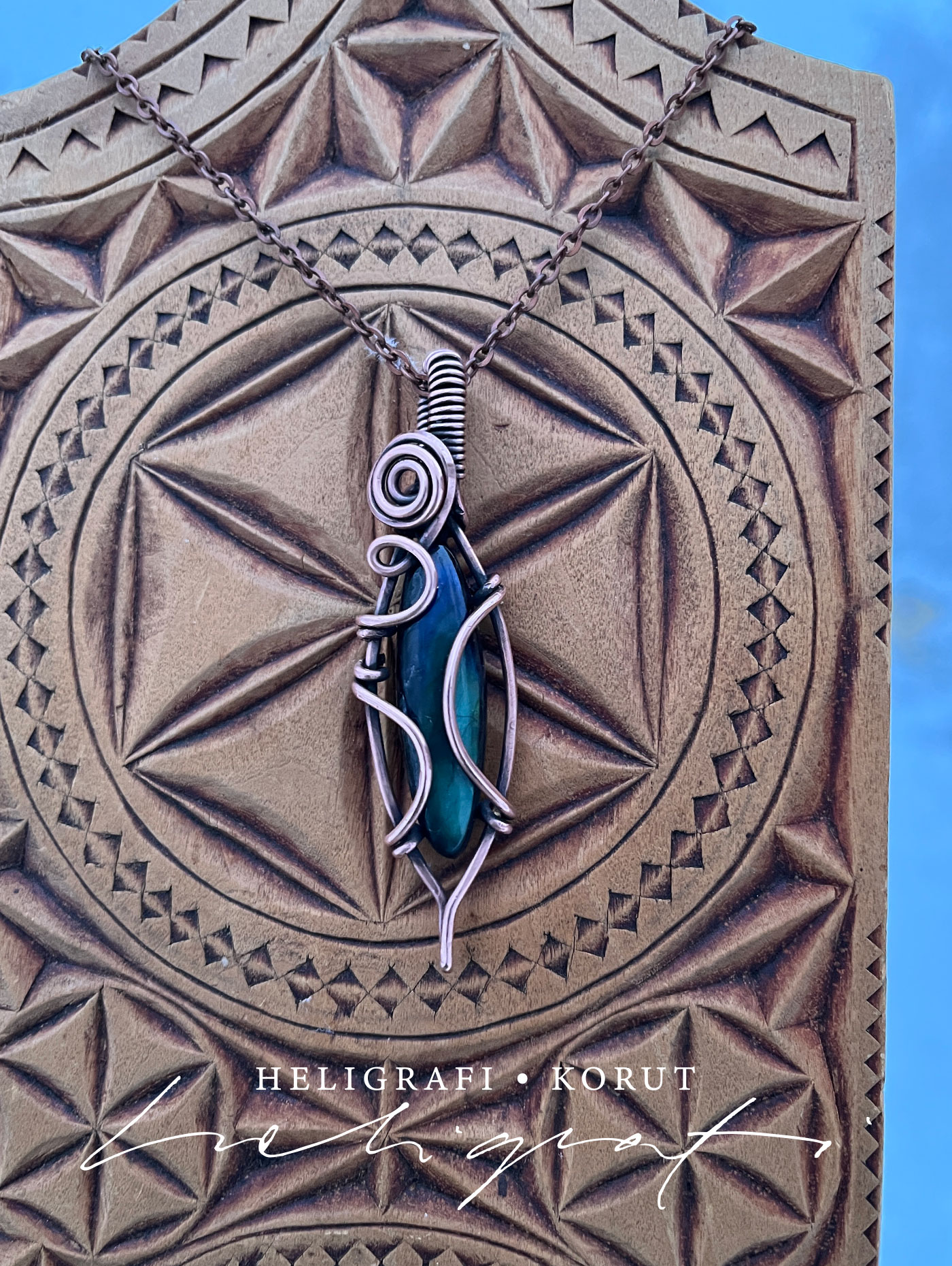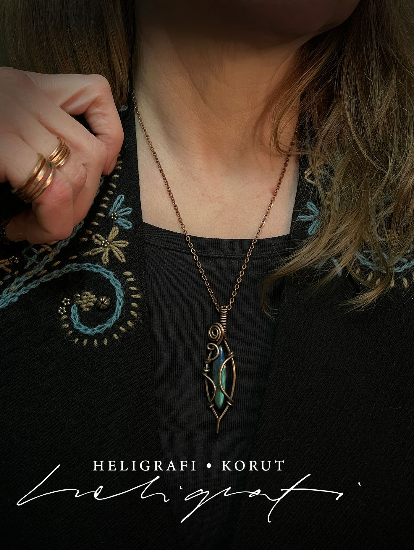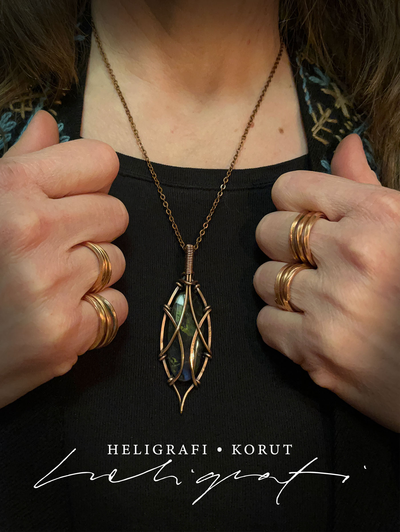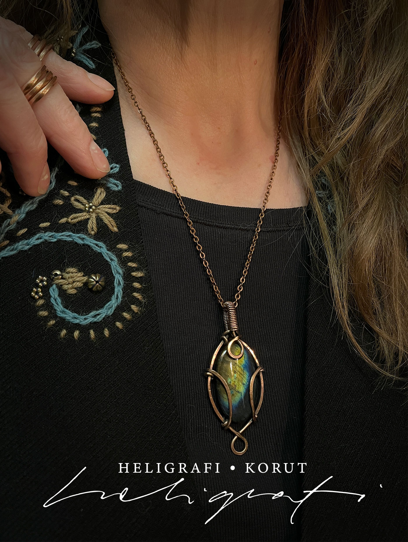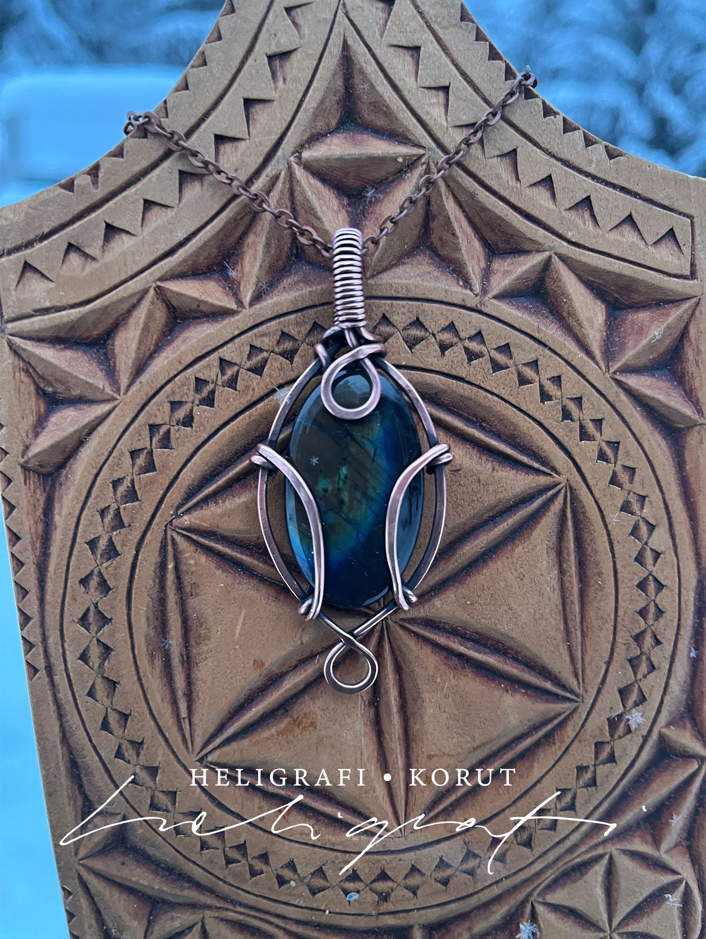 Soikeat Spektroliitti-riipukset on valmistettu kotimaisesta hiotusta spektroliitista ja käsin taivutellusta kierrätetystä kuparilangasta (sähkölanka). Kupari on antiikkipatinoitu ja kiillotettu. Ketju on kuparinväristä terästä, 50 cm pitkä ja siinä on käsin kuparilangasta tehty koukkulukko. Lisäksi mukaan tulee on musta vahattu, 70 cm pitkä puuvillanyöri, jonka saa säädettyä pienemmäksi. Koru pakataan tapetista ommeltuun pussiin ja mukaan tulee 5 x 5 cm kiillotusliina.