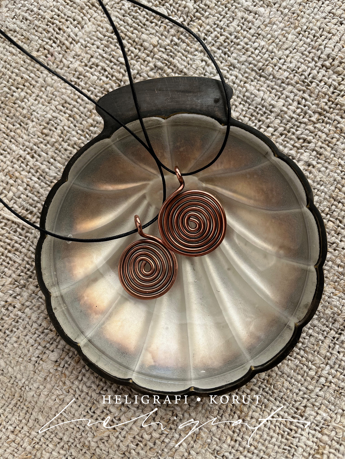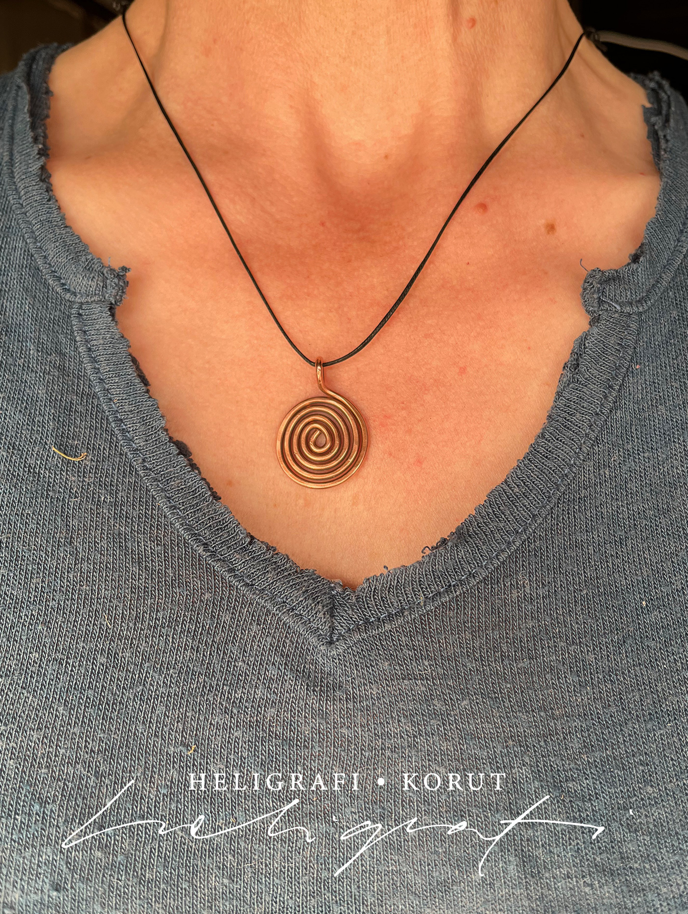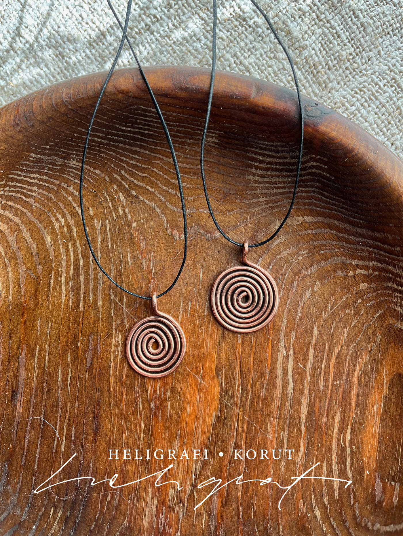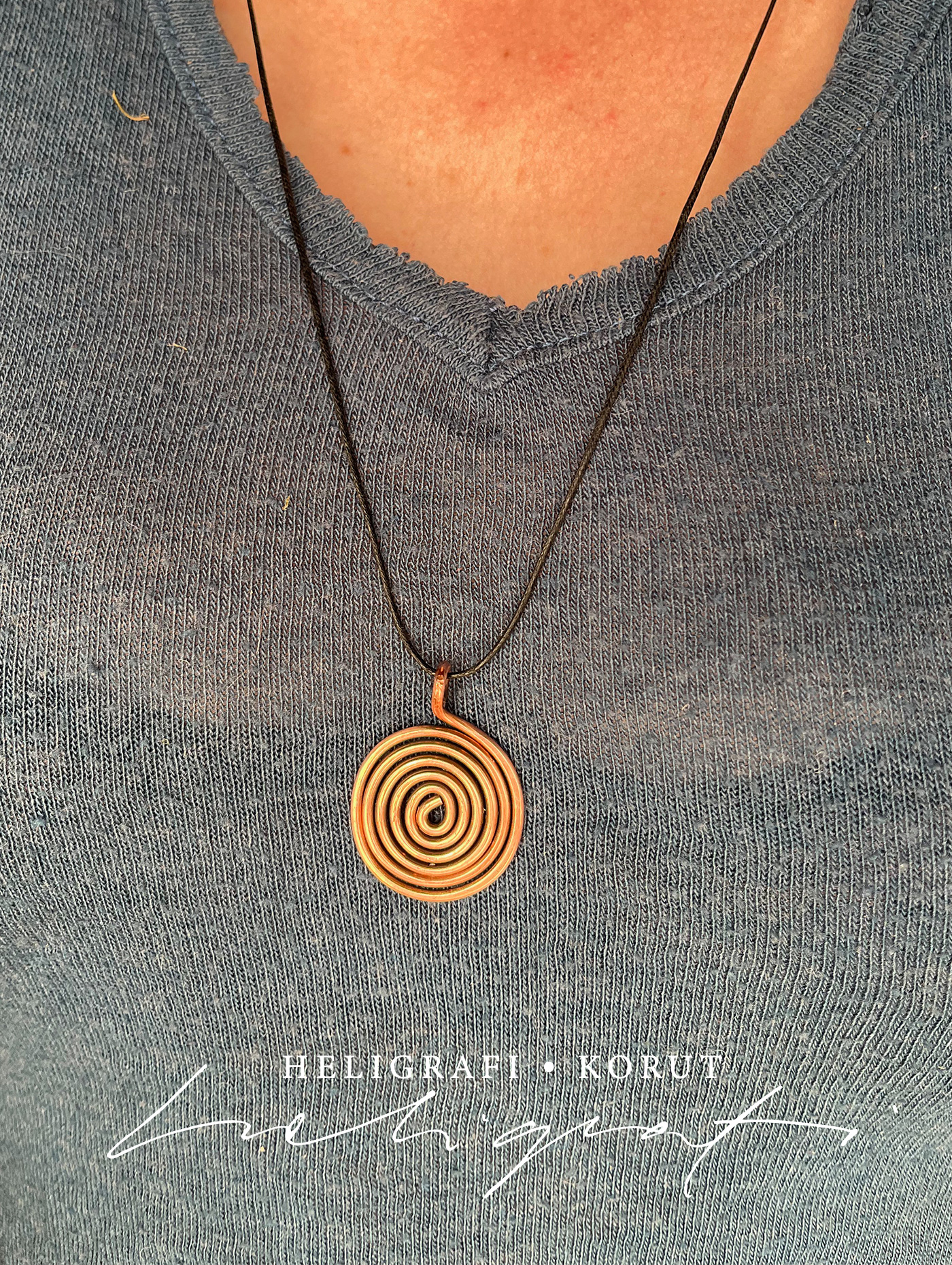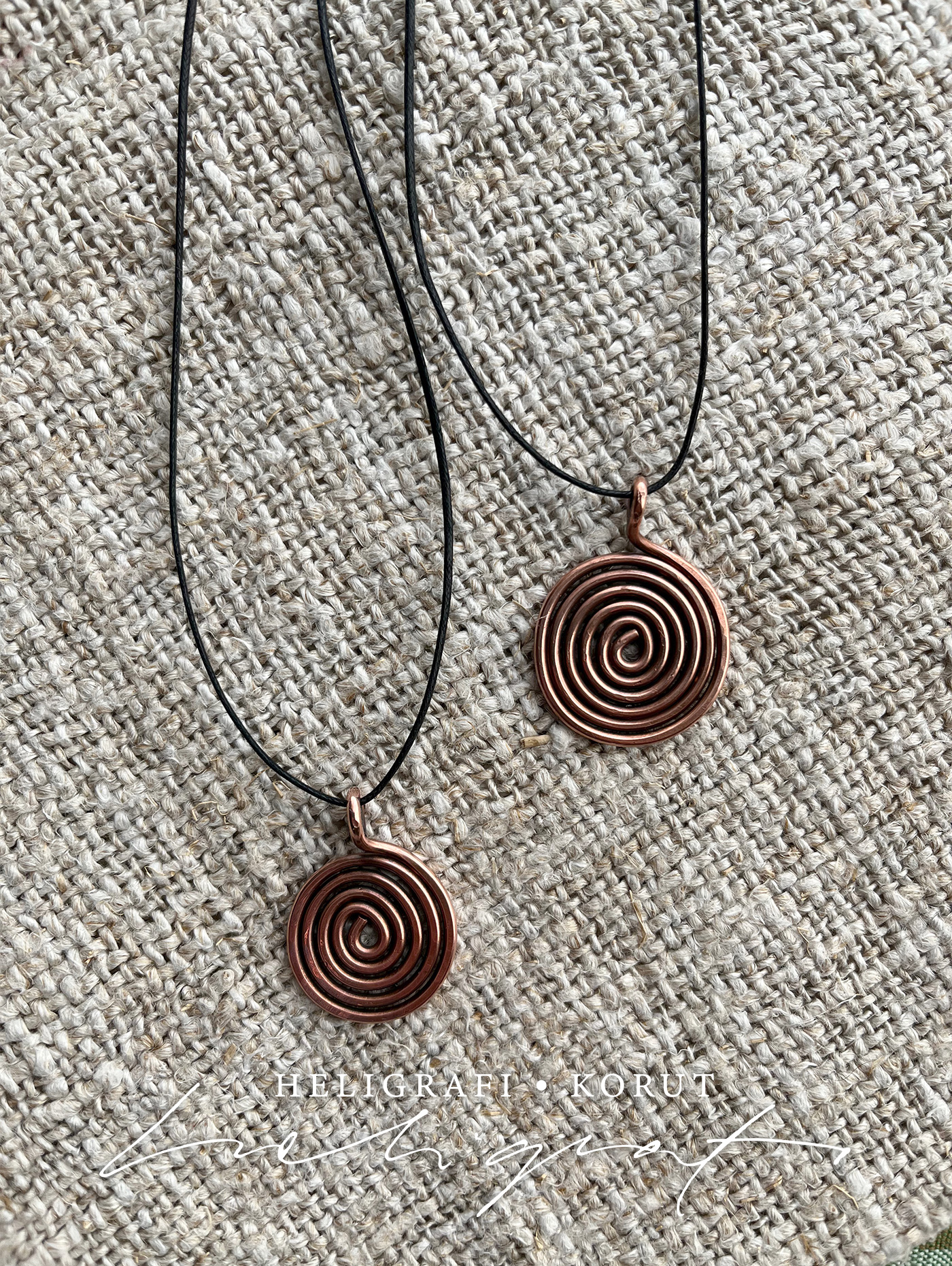 Spiraali-kaulakoru on valmistettu käsityönä kierrätetystä sähkölangasta, eli kuparilangasta. Kuparilanka on taottu, patinoitu ja kiillotettu. Riipuksia löytyy kahdessa koossa: pienen halkaisija om n. 2,2 cm ja ison n. 2,6 cm. Musta vahattu puuvilla nyöri on n. 65 cm pitkä ja siinä on säätövaraa pienemmäksi.